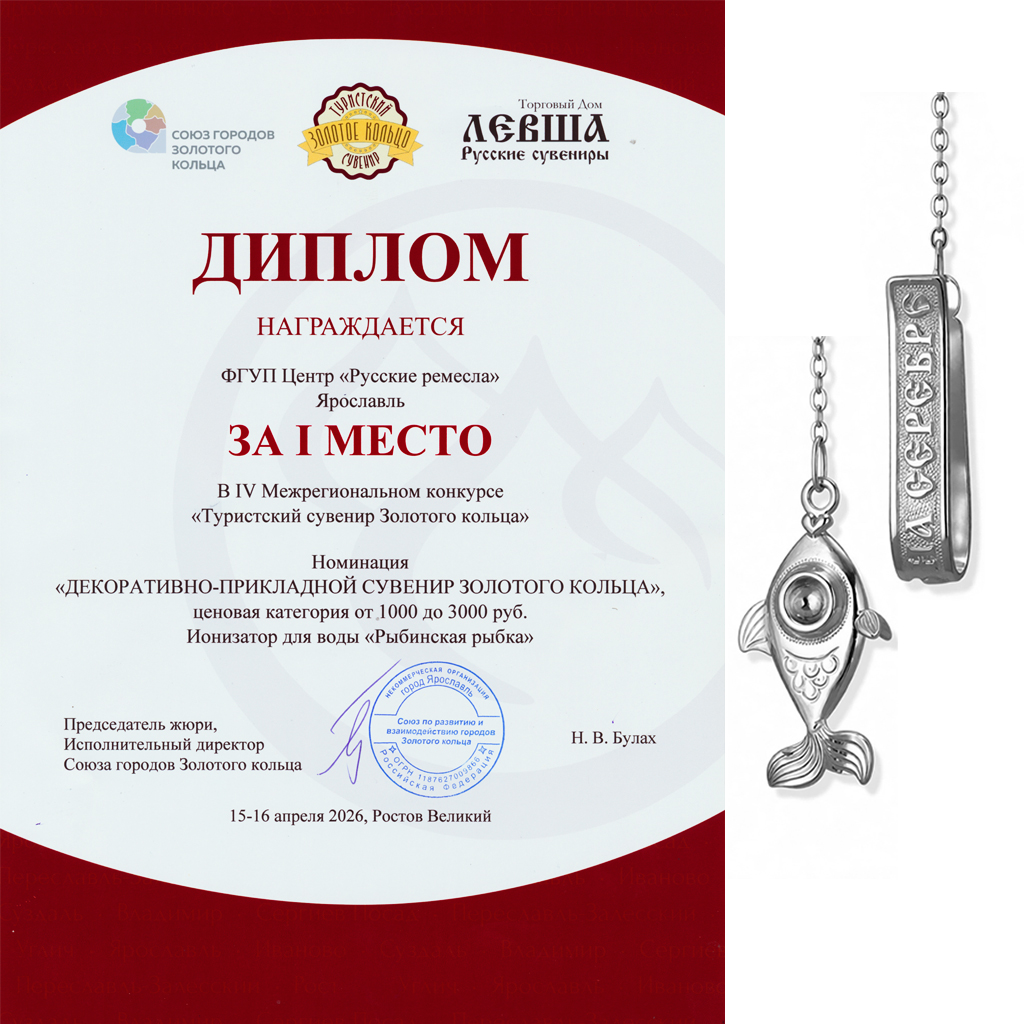 IV Межрегиональный конкурс "Туристический сувенир Золотого кольца" 2026 I МЕСТО Номинация "ДЕКОРАТИВНО-ПРИКЛАДНОЙ СУВЕНИР ЗОЛОТОГО КОЛЬЦА" Ионизатор для воды "Рыбинская рыбка"